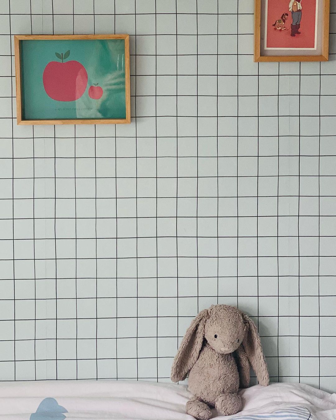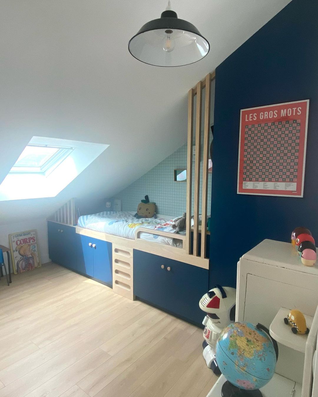 On a donc tout enlevé, mis du parquet, et fait un lit en hauteur sous lequel nous avons fait des rangements, et posé des claustras pour un petit effet « cabane ». Un joli papier peint @lilipinso à carreaux, des cadres, un luminaire récupéré sur un chantier de Baptiste et tadaaaa ✨