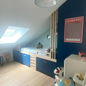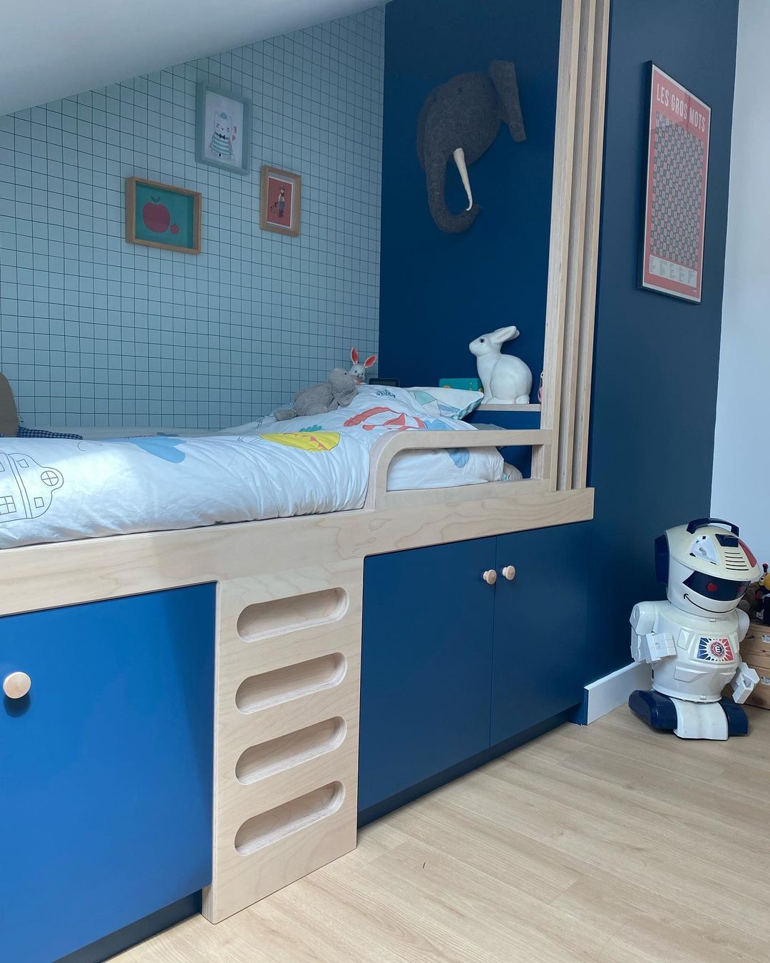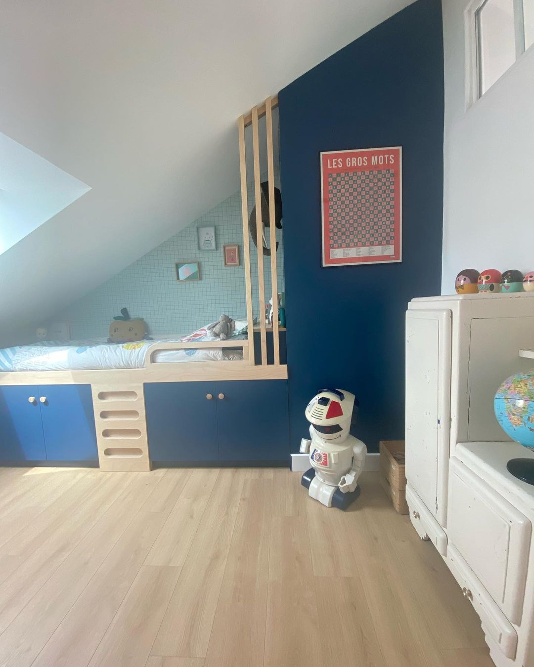 Comme je vous l’ai montré dans mon Reel on a du tout changé car nous avons appris que Siméon est asthmatique et allergique aux acariens : donc fini la moquette et le lit cabane!
